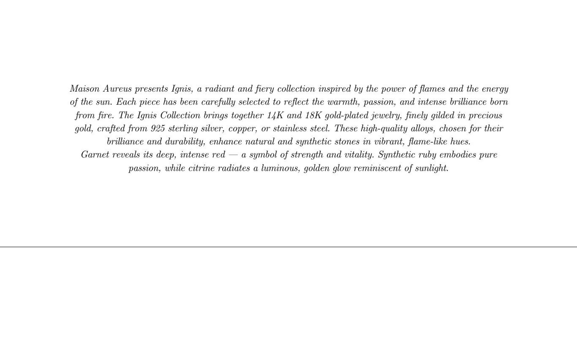 Maison Aureus présente Ignis, une collection ardente et lumineuse, inspirée par la puissance du feu et l’énergie du soleil. Chaque bijou a été sélectionné avec soin pour refléter la chaleur, la passion et l’éclat intense qui naissent des flammes. La collection Ignis réunit des bijoux plaqué or 14K et 18K, dorés à l’or fin, conçus à partir d’argent 925, de cuivre ou d’acier inoxydable. Ces alliages de qualité, choisis pour leur éclat et leur résistance, subliment des pierres naturelles et de synthèse aux nuances flamboyantes. Le grenat y révèle sa profondeur rouge intense, symbole de force et de vitalité. Le rubis de synthèse incarnent la passion pure, tandis que la citrine apporte une lumière dorée et solaire.